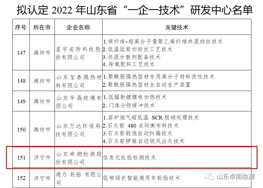 根據(jù)《山東省工業(yè)企業(yè)“一企一技術(shù)”研發(fā)中心培育認(rèn)定工作指南》(魯工信技〔2020〕37號(hào))要求,省工業(yè)和信息化廳組織開(kāi)展了2022年山東省“一企一技術(shù)”研發(fā)中心認(rèn)定工作。經(jīng)企業(yè)申報(bào)、有關(guān)部門(mén)推薦、專家論證等程序,擬將山東卓朗檢測(cè)股份有限公司認(rèn)定為2022年山東省“一企一技術(shù)”研發(fā)中心。